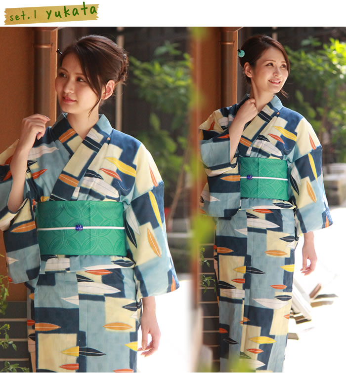 柄詳細 色:水色地 紺 クリーム 白 黄 オレンジ 柄:市松 葉模様 カラフルな変わり市松模様にカラフルなリーフ柄が個性的なレトロ可愛い浴衣です。