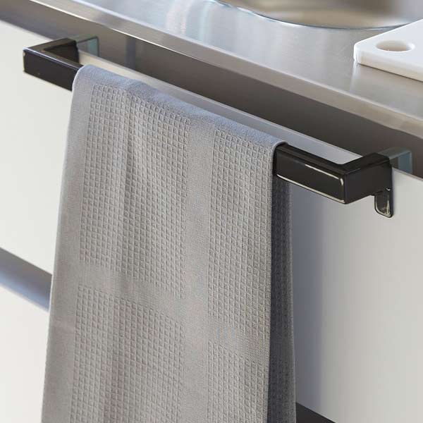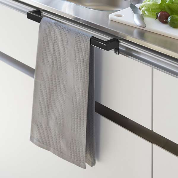 ■スペックデーター■サイズ:約 幅33×奥行6×高さ4(cm)材質:バー/スチール(ユニクロメッキ+粉体塗装)フック/スチール(ユニクロメッキ)カラー:ブラックセット内容:付属品/緩衝材・6枚、六角レンチ×1備考:対応サイズ/本品の幅約33cm以上の扉(扉のハンドル等を含まず)扉の厚さ/約1.4〜2.5cmまで扉と上部との隙間/約5mm以上が必要耐荷重/約1kgシンプルでスタイリッシュなデザインのタオル掛け 山崎実業(YAMAZAKI) キッチンタオルハンガーバー タワー ワイド ブラック 2856 tower ●扉の厚みにぴったり調節できるスタイリッシュなタオルハンガーです。