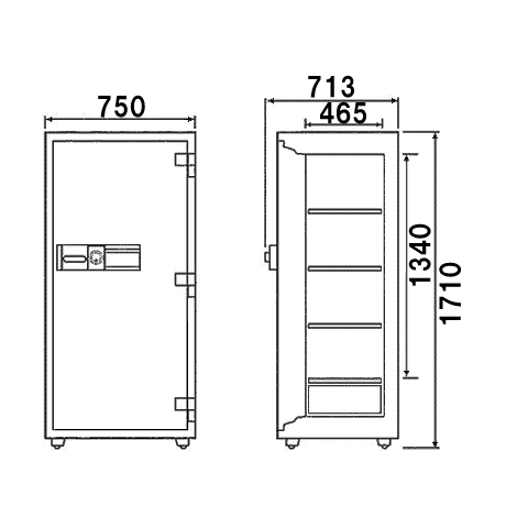 >>テンキー式強化型耐火金庫 金庫診断士推奨品 型式 テンキー式耐火金庫(DDE170) 外寸 幅750×奥行き713×高さ1710mm 内寸 幅570×奥行き465×高さ1450mm 重量 460kg 内容量 384L 付属品 鍵2本・引出し用鍵2本・取扱説明書 装備 棚板3枚、鍵付き引出し1個:引出し内寸(幅530×奥行き335×高さ90mm) キータイプ ディンプルキー カラー ライトグレー 性能 一般紙用90分耐火試験合格(SP規格※スウェーデン国立研究所規格)(90分加熱した時点で、庫内温度150℃以下で中に入れた新聞紙が判読可能) 開錠方法 暗証番号+鍵 製造国 韓国 メーカー ダイヤセーフ株式会社 ◇商品画像には、防犯上の観点から、カンヌキの本数と場所は表示しておりません。