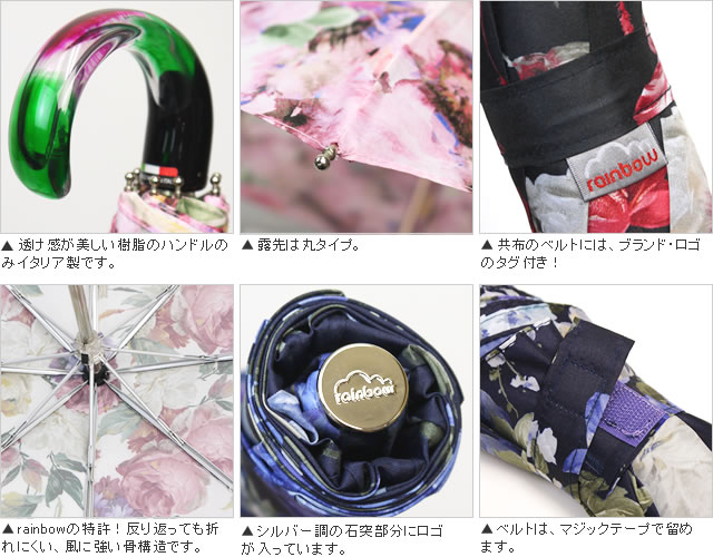 傘生地は、まるで絵画のようなフラワーモチーフのプリントがフェミニンでとっても上品! rainbowの特許でもある特別な機構を用いることによって、風で傘が反り返っても傘骨が折れにくい!折れやすいがために長持ちしない折りたたみ傘も、これなら末永くお使い頂けます。